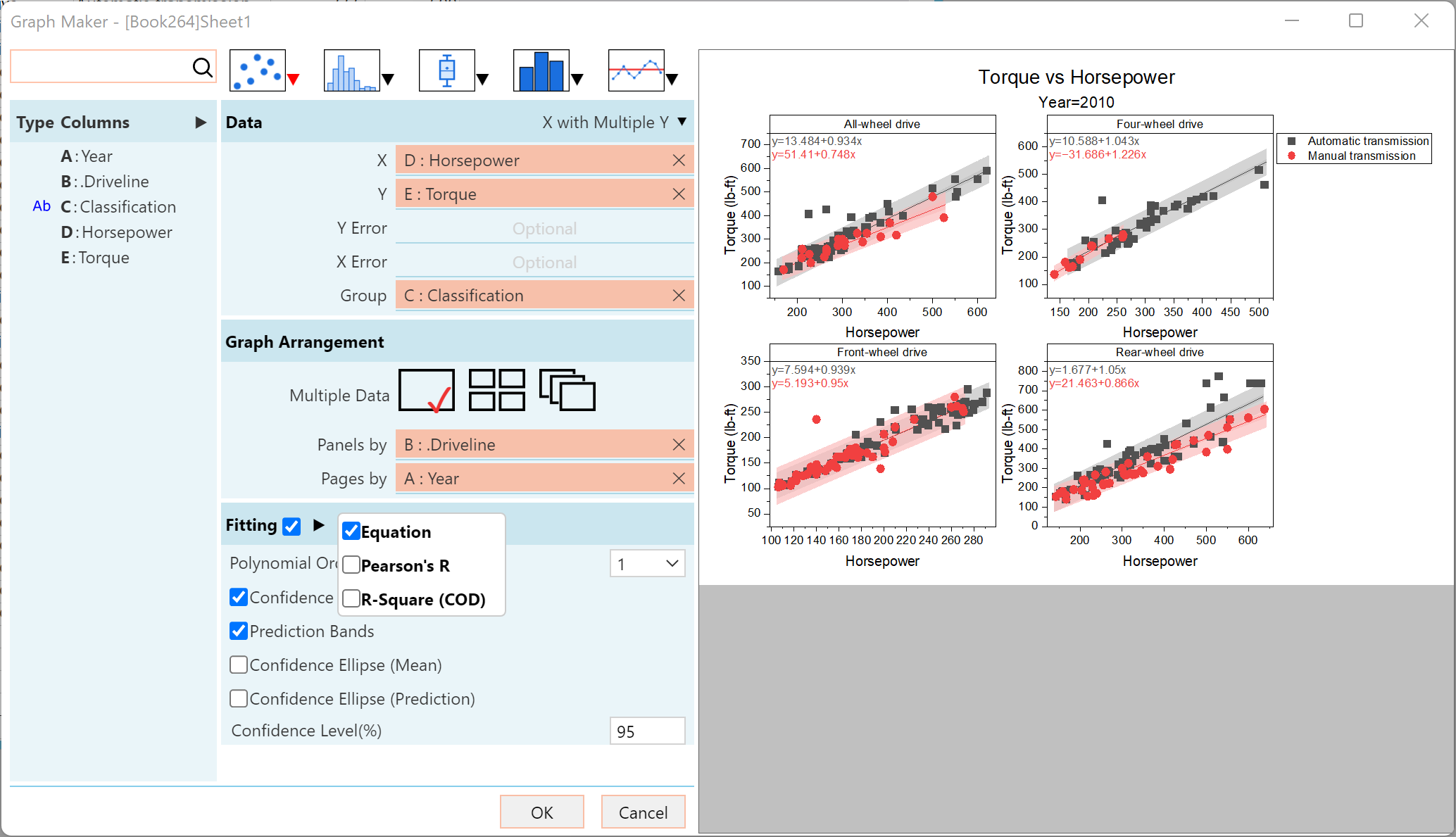 Fitting is available for certain plot types. When enabled, you can easily customize the graph to display confidence or prediction bands, as well as show the fitting results directly on the graph.
