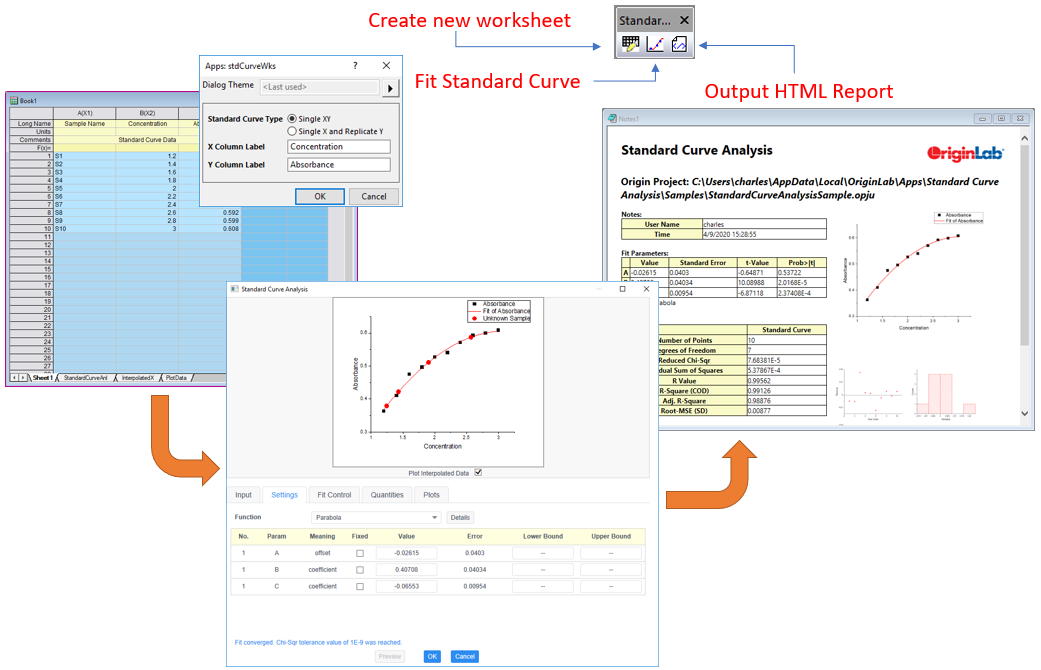 This app provides a sample OPJU file. Right click the App icon in the Apps Gallery window, and choose Show Samples Folder from the short-cut menu. A folder will open. Drag-and-drop the project file StandardCurveAnalysisSample.opju from the folder onto Origin. The Notes window in the project shows detailed steps.