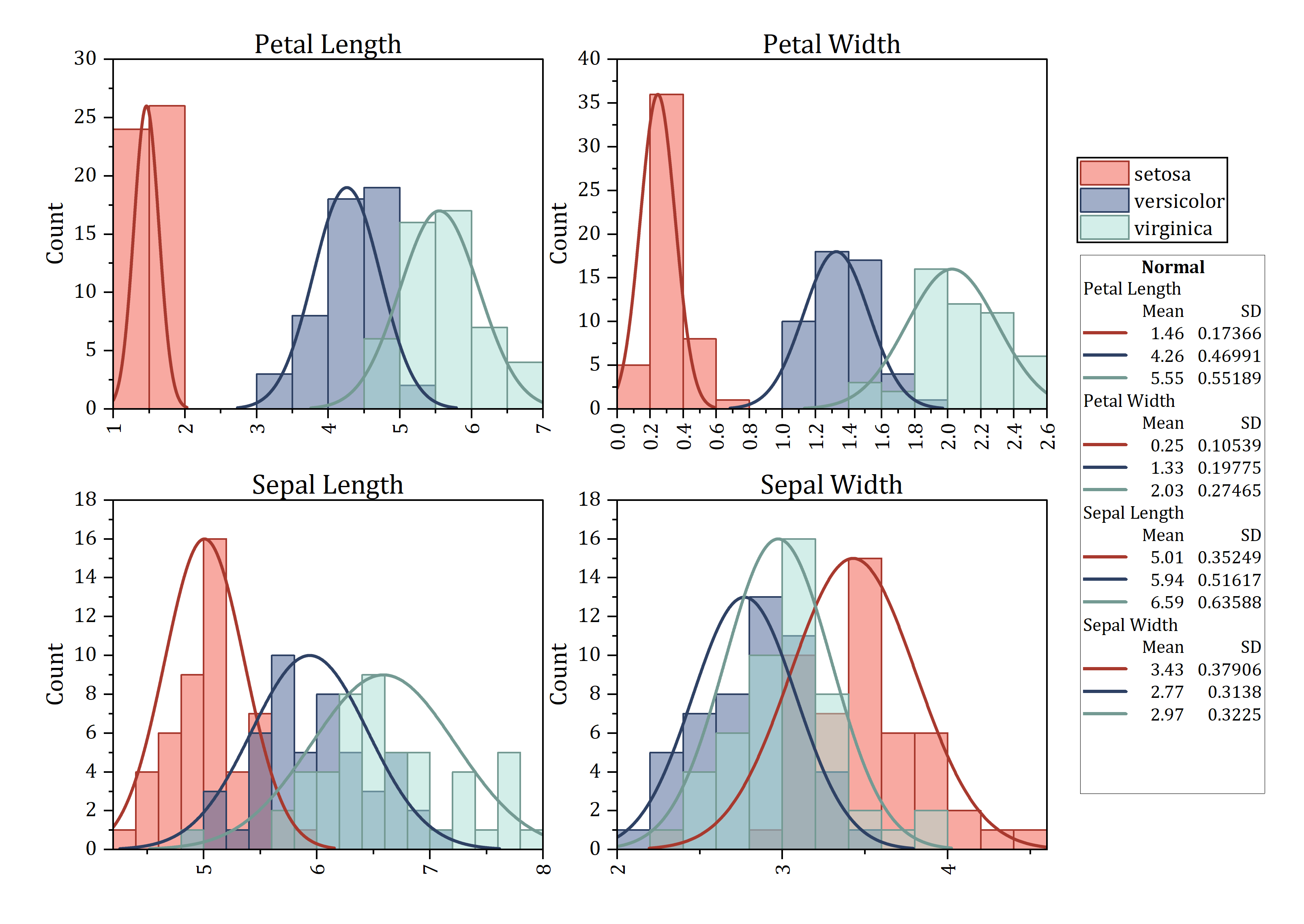 For histogram, 7 distribution type are available for the distribution curve, normal, lognormal, weibull, exponential, gamma, laplace, lorentz, kernel smooth, poisson, binomial. The distribution parameter estimations can be easily added on the graph