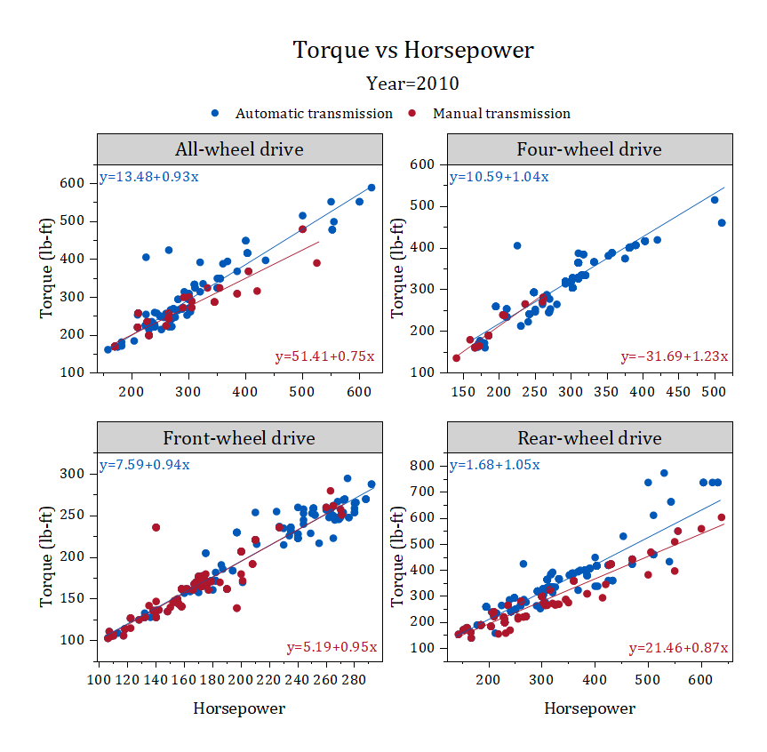 Origin provides options to perform linear fit or show confidence ellipse on each group of data points, plus flexible layout arrangement to help user to create professional graphic report